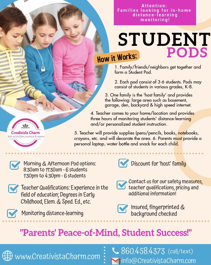 Looking for assistance with online or hybrid learning? Form a Learning Pod! We are a distance-learning monitoring, assistance and troubleshooting program for students learning from home!